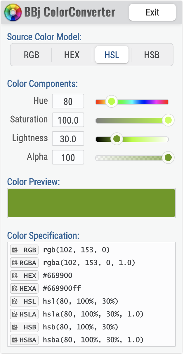 is a BBj Custom Class that provides commonly-used routines to convert and format colors in a variety of models including Java Color, BBjColor, and RGB, HSL, and hexadecimal representation.